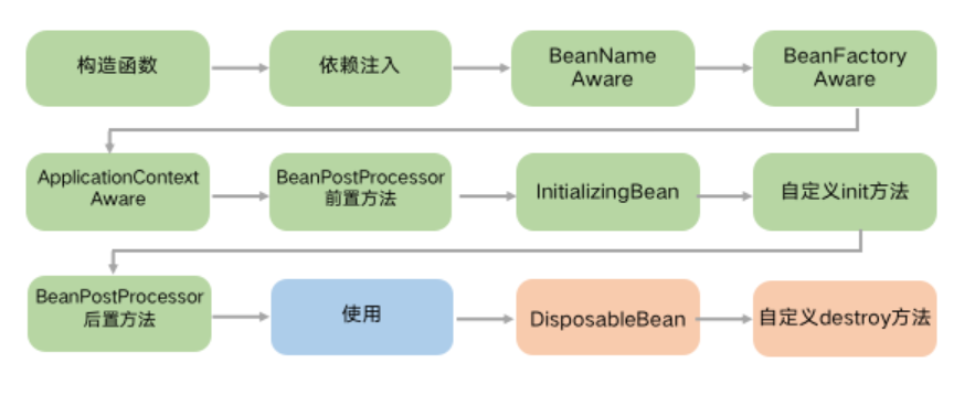 面试中经常问到 Bean 的生命周期,如下图,我们先看绿色的部分,Bean 的创建过程。