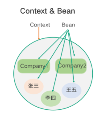 Spring 进行 IoC 实现时使用的两个概念:Context 上下文和 Bean。如下图所示,所有被 Spring 管理的、由 Spring 创建的、用于依赖注入的对象,就叫作一个 Bean。Spring 创建并完成依赖注入后,所有 Bean 统一放在一个叫作 Context 的上下文中进行管理。