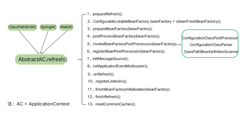 不论哪种 Context,创建后都会调用到 AbstractApplicationContext 类的 refresh 方法,流程如下。