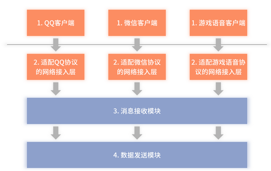 从图 5 中不难发现,除了编号 1 的微信 App 和编号 2 的网络接入层模块与图 4 有差异,其余各模块的功能基本上与图 4 类似。网络接入层之所以有差异,是因为接入层需要进行通信协议的解析,而 QQ 和微信的网络通信协议是根据各自的客户端进行定制的,因此会有格式上的差异。