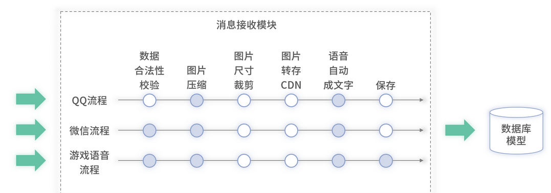 以上述消息接收模块为例,它包含了一个代码进程和对应的消息存储(假设为 MySQL)。为了解决此模块的重复,可以合并 QQ、微信和游戏语音里此模块的代码。同时在前期设计时,各个业务只考虑自己的消息格式,所以它们的数据库的表结构是偏定制的,无法直接被复用,因此在重构时,还需要设计一套全新的、兼容原有三个版本的数据库。此时消息接收模块的重构架构如下图 8 所示: