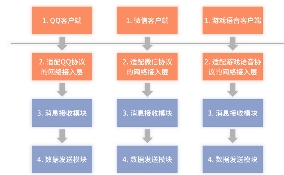 类似上述介绍的这种模式:即系统架构大体上类似,其中只有个别模块存在差异,但各个研发团队还是从零开始建设全部模块的方式,称为烟囱式架构。为了方便你理解,我把QQ、微信以及游戏语音的架构放在一张图中,如下图 6 所示: