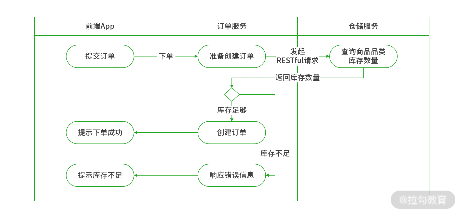 为了便于理解,我们模拟实际案例进行说明。假设某电商平台日常订单业务中,为保证每一笔订单不会超卖,在创建订单前订单服务(order-service)首先去仓储服务(warehouse-service)检查对应商品 skuId(品类编号)的库存数量是否足够,库存充足创建订单,不存不足 App 前端提示“库存不足”。